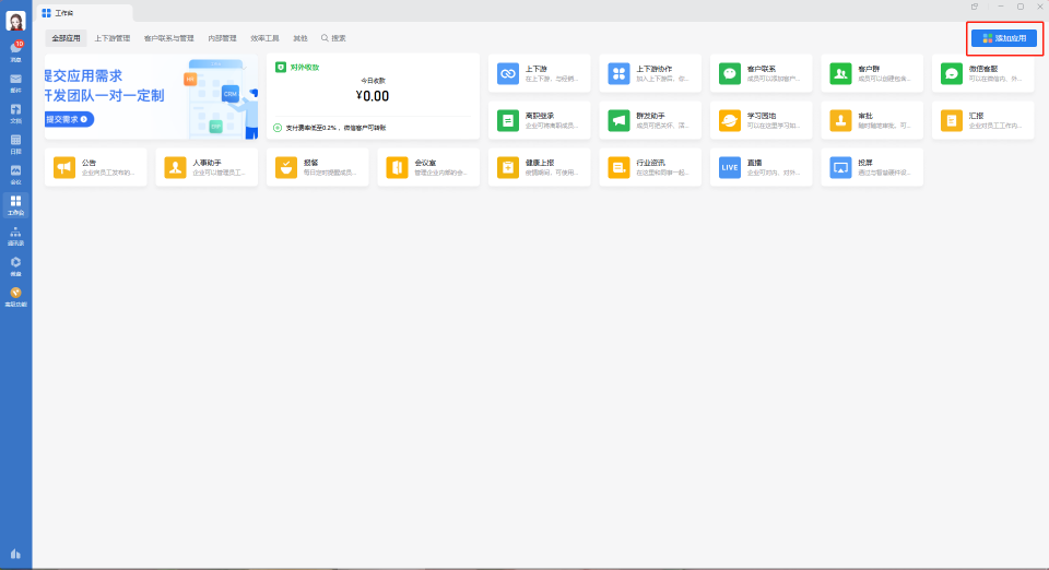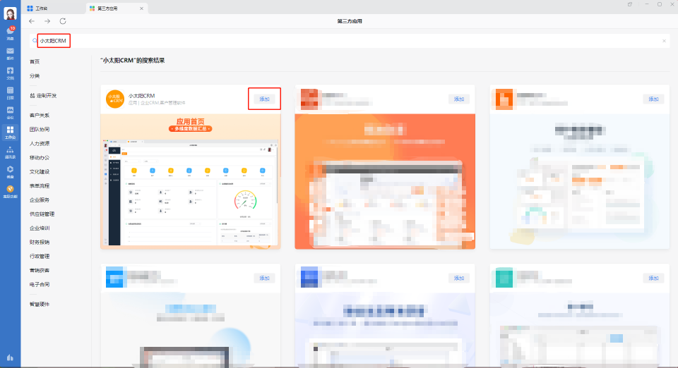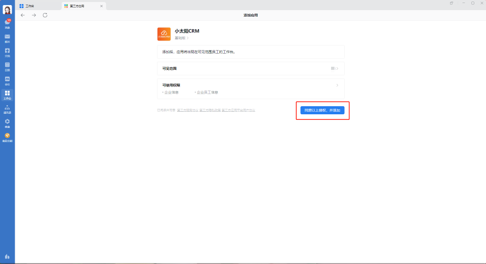 2、若工作台中没有显示小太阳CRM,联系企业微信管理员,为您设置可见范围。