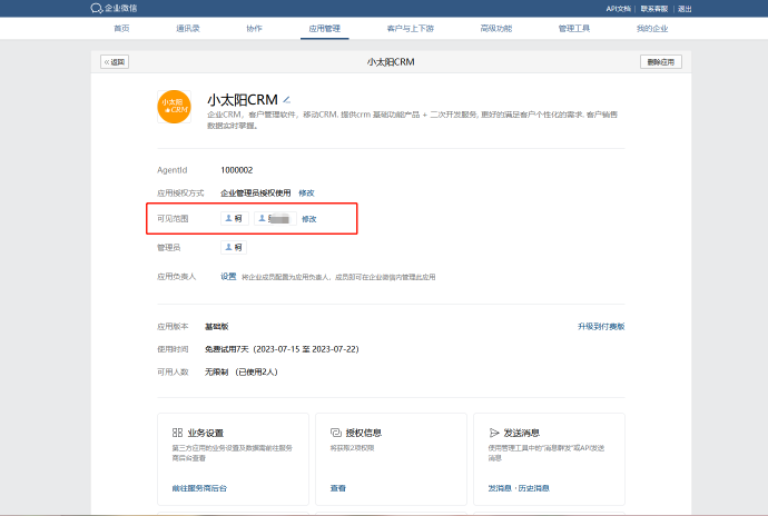 管理员登录企业微信管理后台(https://work.weixin.qq.com/wework_admin/frame#apps),进入小太阳CRM,点击修改可见范围,添加同事一起使用应用。