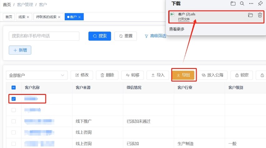 导出:首先勾选所要导出的单个或多个客户,直接导出,客户信息会以Excel表格的形式导出进自己的电脑文件里。