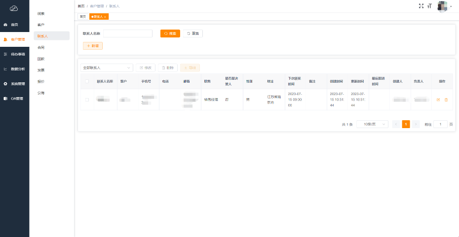 3.1基础功能:新增/修改/删除联系人信息,用户只可以查看当前账号数据权限下的联系人数据
